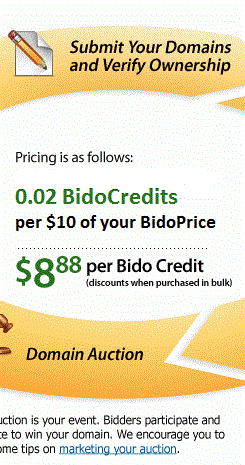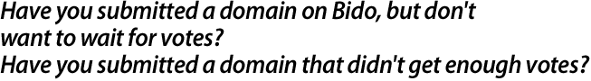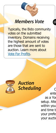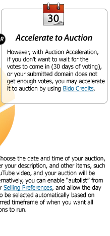 The Bido members vote on the submitted domains to go to auction. Crowdsourcing votes from the members allows the best domains to make it to auction. However, if you don't want to wait 30 days for enough votes to come in, or if your domain didn't get enough votes, you may accelerate your listing to auction by using Bido Credits.